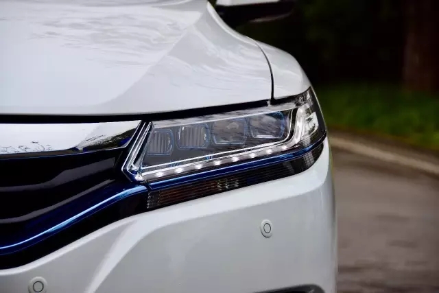 沿襲Honda家族飛翼式前臉造型,相較汽油版,新思鉑睿銳·混動的進氣格柵特意增加了混動車型專屬的藍色飾條。藍色接近天空的顏色,正好將混動車環(huán)保的特性凸顯出來,而晶鉆式全LED前大燈由于藍色描邊的點綴,看起來也比汽油版的更富科技感。