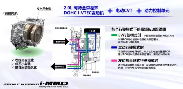 本田i-MMD混動系統(tǒng)由2.0L阿特金森循環(huán)發(fā)動機、動力控制單元PCU、高功率電機、以及大容量鋰離子電池組成,可根據(jù)道路條件的不同自動切換行駛模式。這套混動系統(tǒng)最主要的特點是,它不僅可以像其它混動系統(tǒng)一樣提供出色的燃油經濟性,而且對動力響應的要求也絕不降低,所以被稱為運動型混合動力系統(tǒng)。