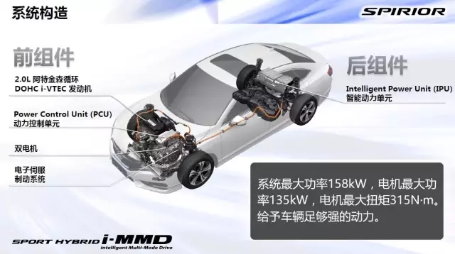 它的組成部分包括了ERT(EARTH DREAMS TECHNOLOGY)直噴技術和DOHC i-VTEC技術的使用阿特金森循環(huán)的汽油發(fā)動機、內含有發(fā)電機、驅動用電機和動力分離裝置的e-CVT電氣式無級變速箱、PCU(Power Control Unit,動力控制單元)、鋰電池組等部分組成。在中低速工況下,發(fā)動機都不直接與車輪通過機械傳動結構相連,只有在高速巡航工況下,發(fā)動機才會與車輪的機械傳動機構通過離合器連接,單獨由發(fā)動機提供動力,切斷電機的動力;僅在必要的情況下啟動電機輔助。