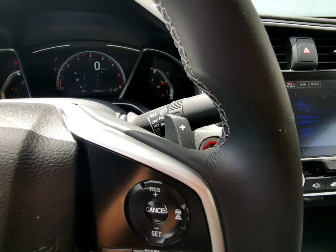 新款思域在老款的基礎(chǔ)上,新增了一套模擬換擋撥片,為駕駛體驗(yàn)再添幾分姿色。儀表盤的整體造型不變,但儀表盤顏色由之前的藍(lán)色變?yōu)榧t色,表明了它的特殊身份。
